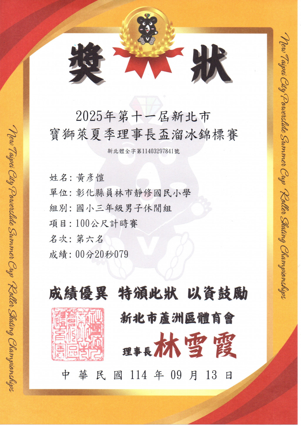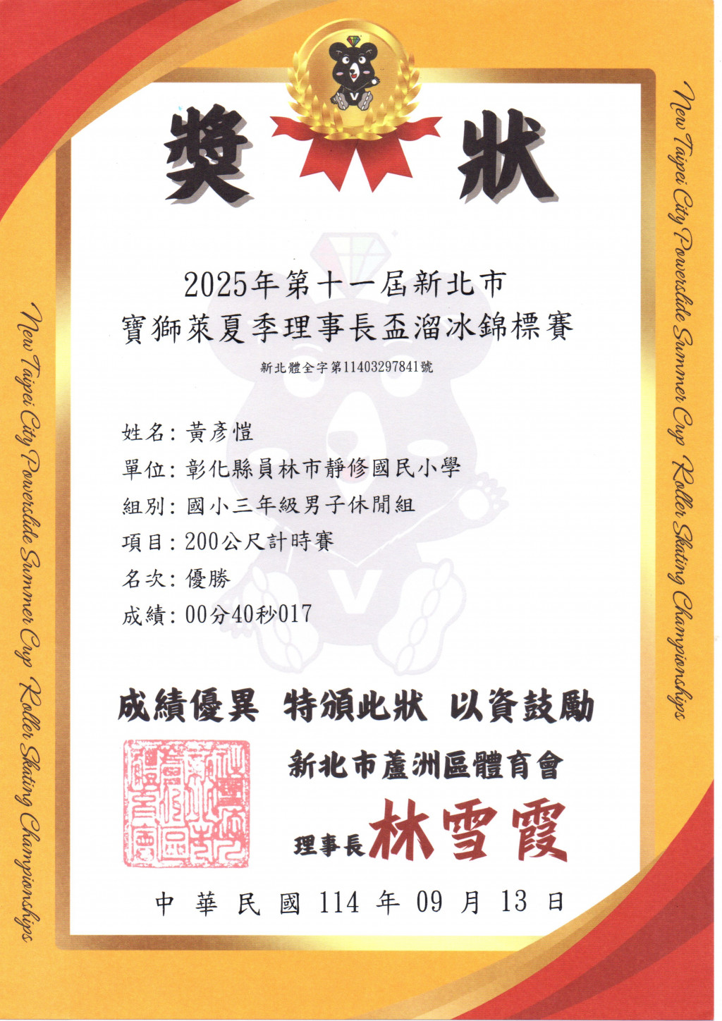 賀308黃彥愷參加新北巿寶萊夏季理事長盃溜冰錦標賽榮獲佳績。