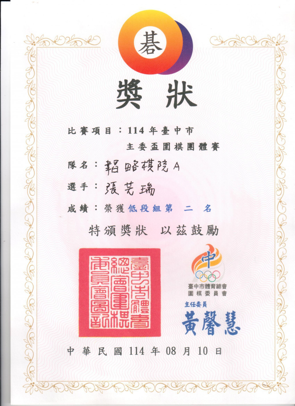 114年台中市主委盃圍棋團體賽低段組第二名