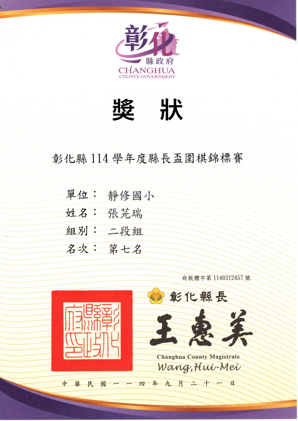 彰化縣114學年度縣長盃圍棋錦標賽二段組第七名