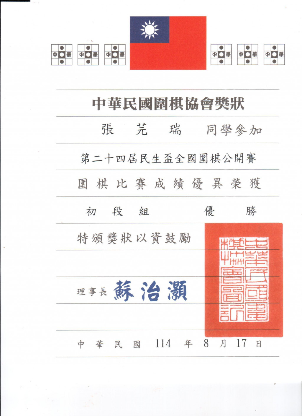 第24屆民生盃全國圍棋公開賽-低段組優勝