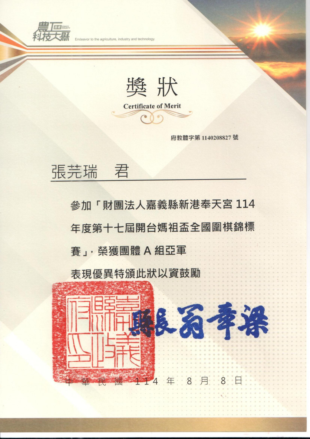 財團法人嘉義縣新港奉天宮開台媽祖盃全國圍棋錦標賽團體A組亞軍