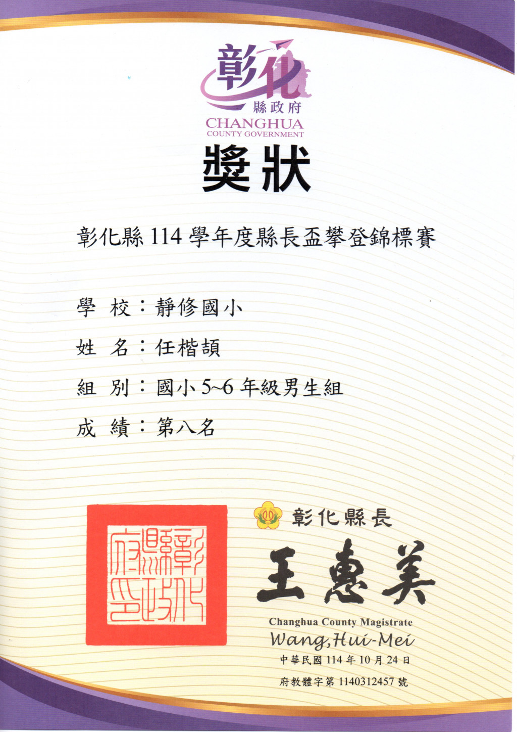 5.610任楷頡榮獲國小5~6年級男生組第八名。