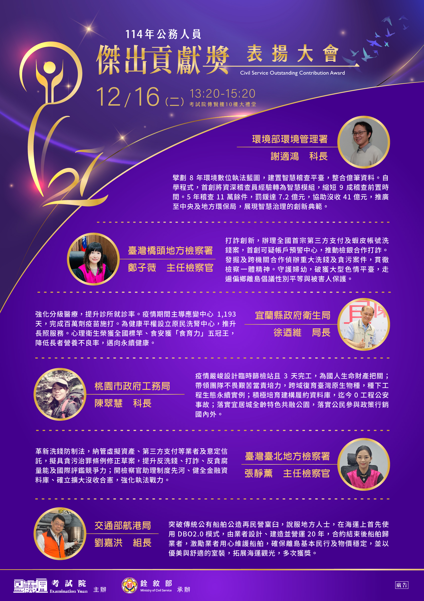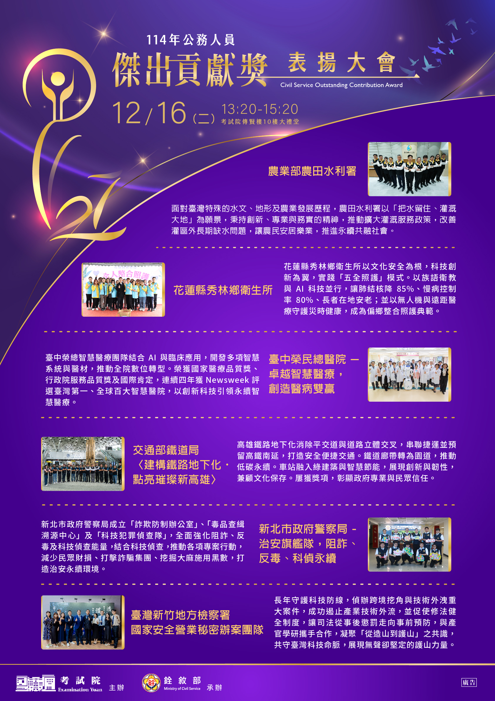 | 二、 | 本(114)年公務人員傑出貢獻獎業經考試院組成評審委員會評選出6名得獎人及6組得獎團體。為表揚得獎者傑出事蹟,考試院訂於本年12月16日(星期二)下午1時20分於考試院傳賢樓10樓大禮堂舉行表揚大會。 |