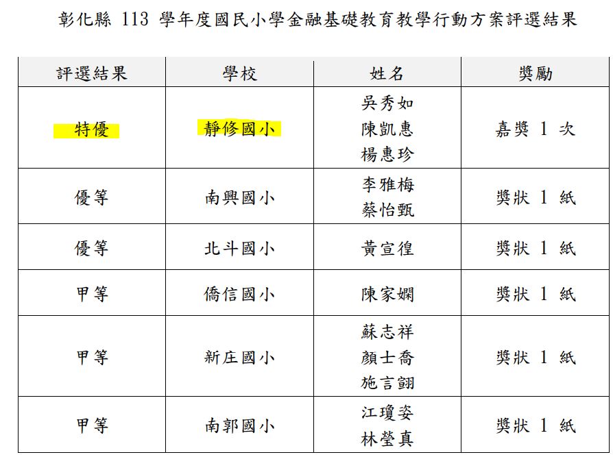 吳秀如老師、陳凱惠老師參加彰化縣114學年度金融基礎教育教學實施成果徵選榮獲特優