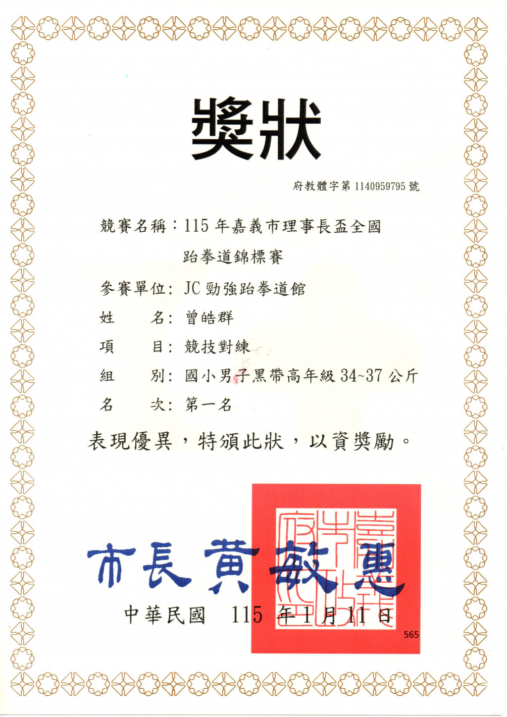 1.609曾皓群榮獲男子黑帶高年級34~37公斤級第一名。