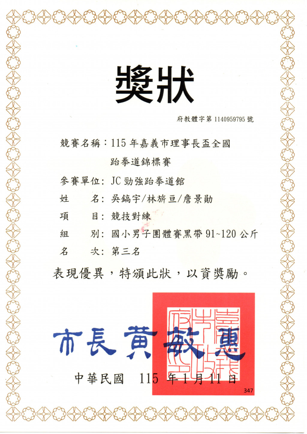 4.607林旂亘榮獲男子團體賽黑帶組第三名。
