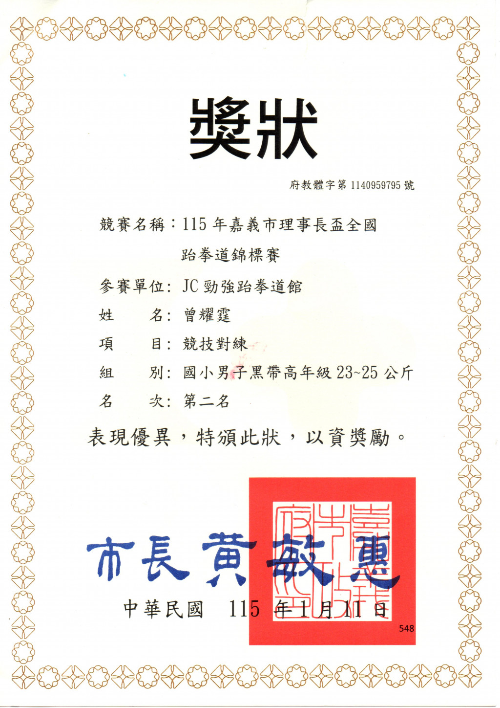 3.203曾詠睿榮獲男子色帶低年級23公斤以下級第二名。