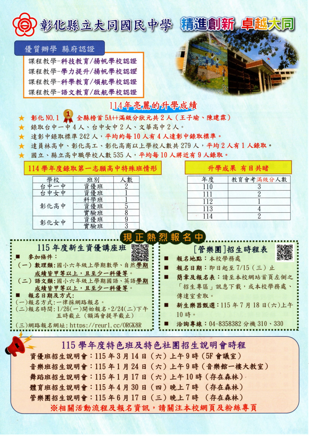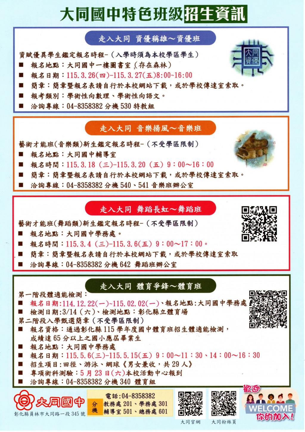轉知彰化縣大同國中特生班級招生資訊,詳情請參閱照片。