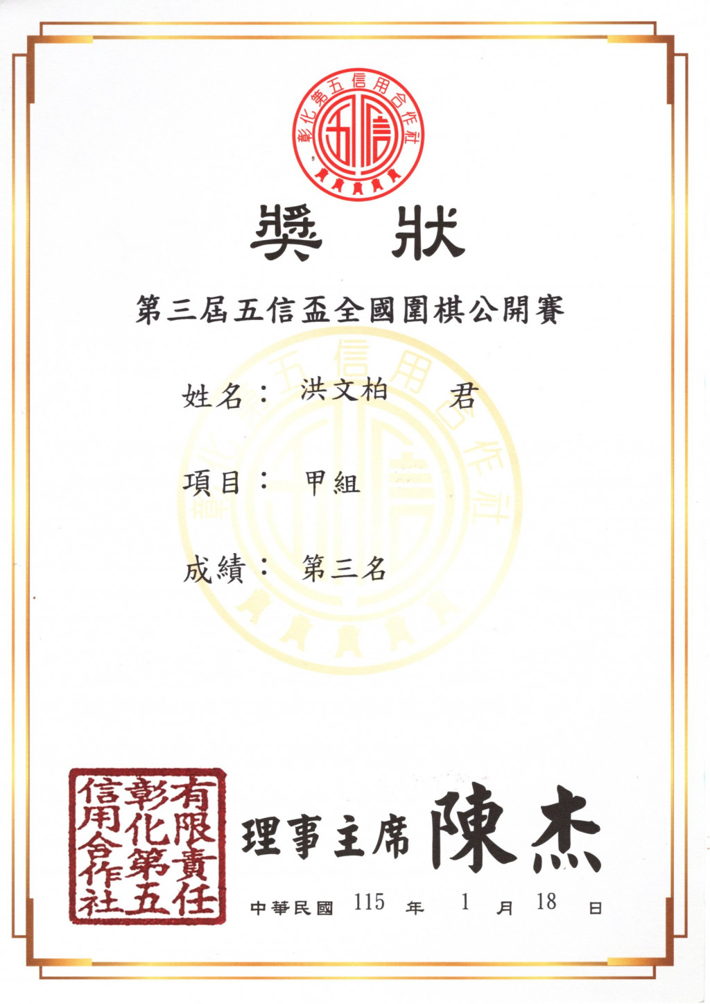 洪文柏第三屆五信盃全國圍棋公開賽 甲組第三名