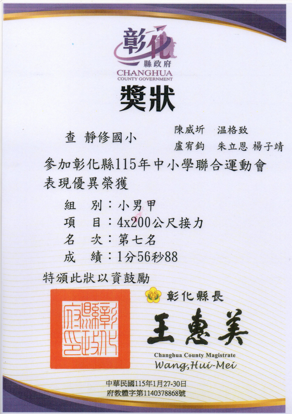 3.女生400公尺接力第八名,58秒65(602施羽芯、604朱莘穎、608邱羽瑄、608謝承妡)。