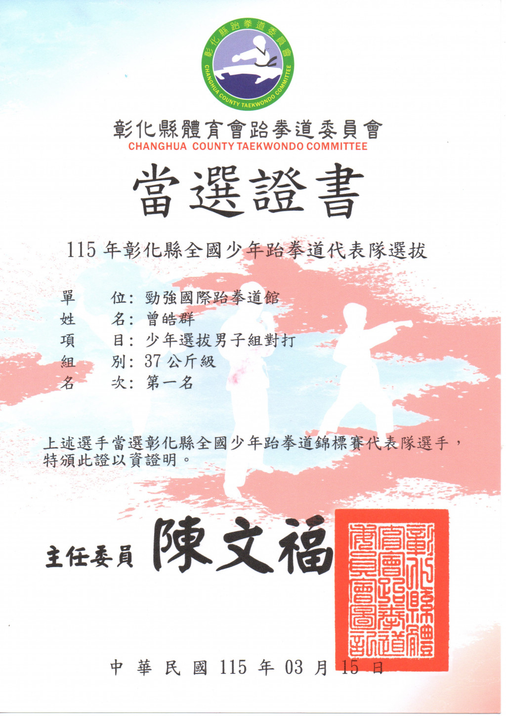 3.609曾皓群榮獲男子組對打347公斤級第一名。當選代表隊。