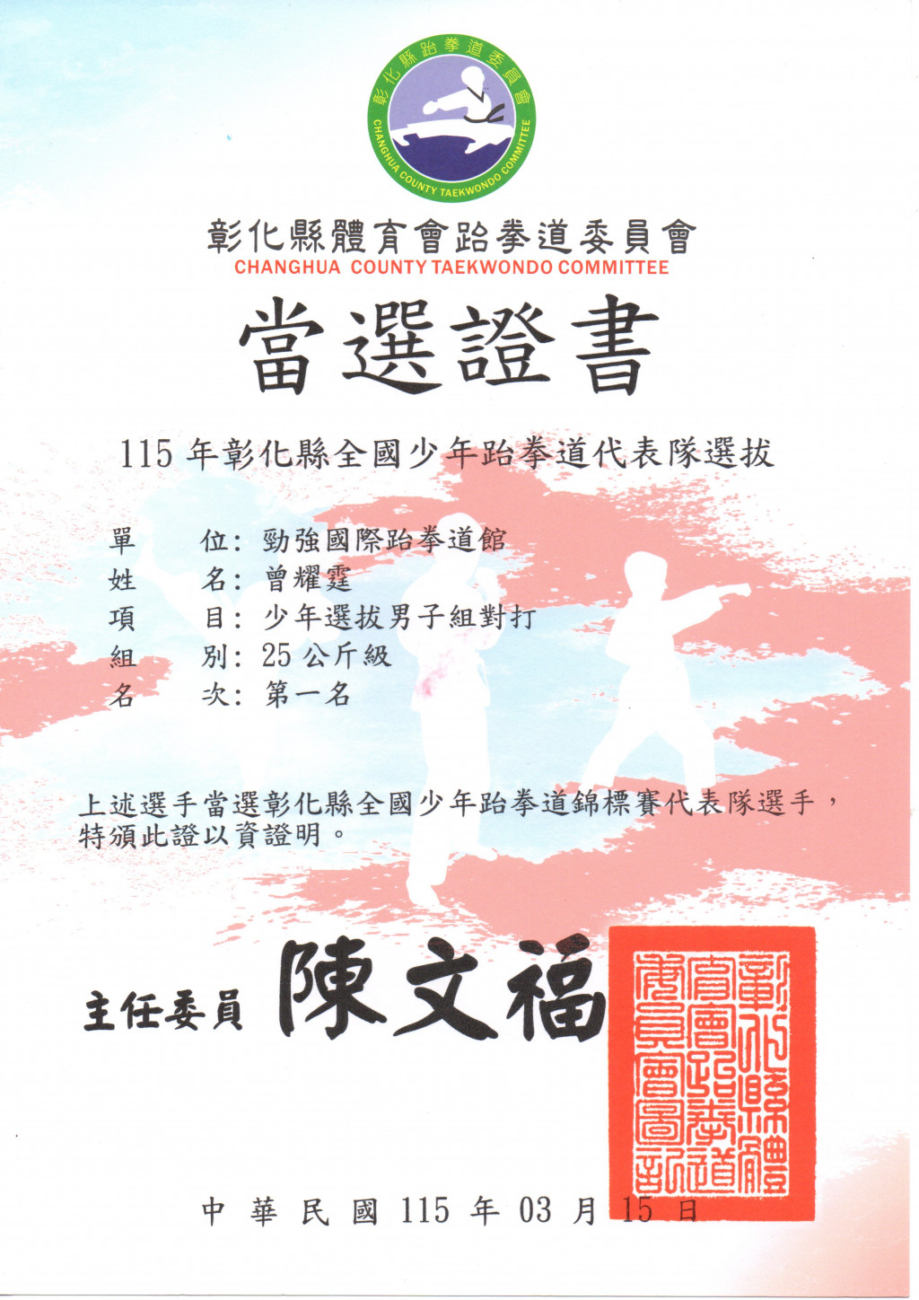1.413曾耀霆榮獲男子組對打25公斤級第一名。當選代表隊。