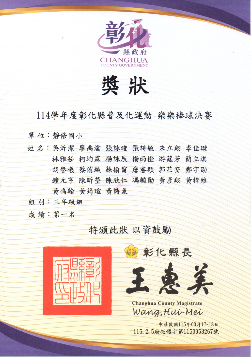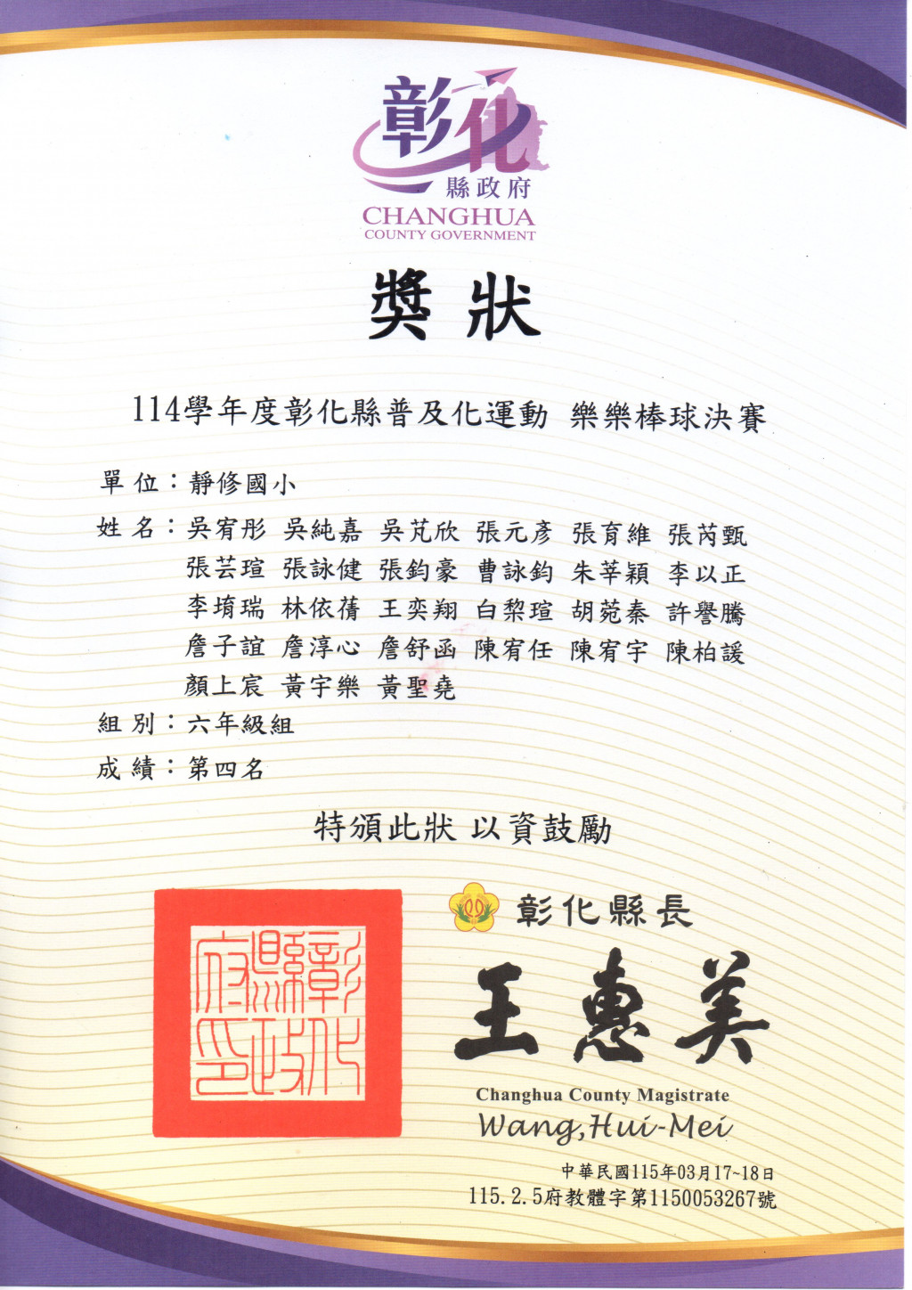 賀本校參加114學年度彰化縣普及化運動樂樂棒球賽榮獲佳績。