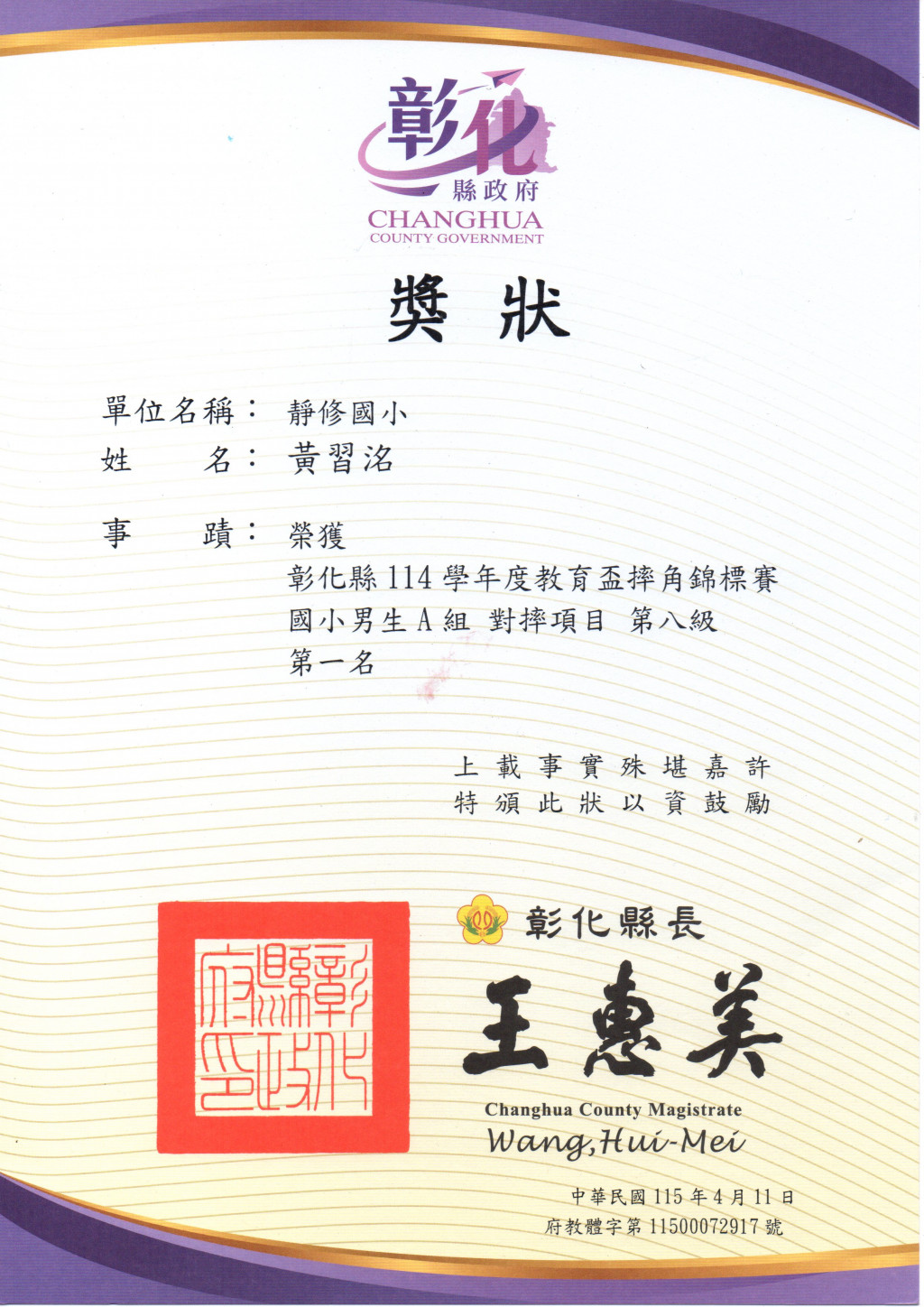 1.512黃習洺榮獲男生A組對摔第八級第一名。