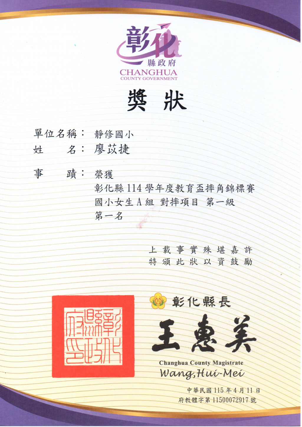 3.207廖苡捷榮獲女生A組對摔第一級第一名。