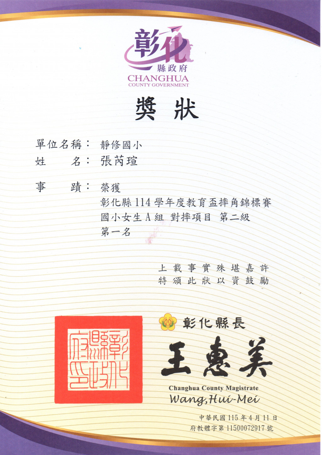 5.612粘芷嫙榮獲女生A組對摔第四級第二名。